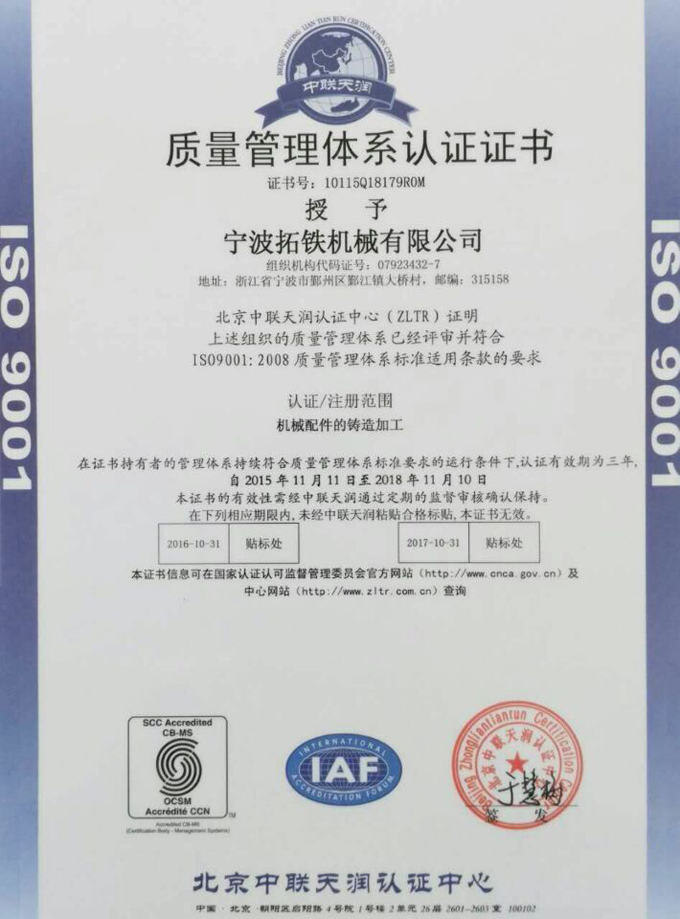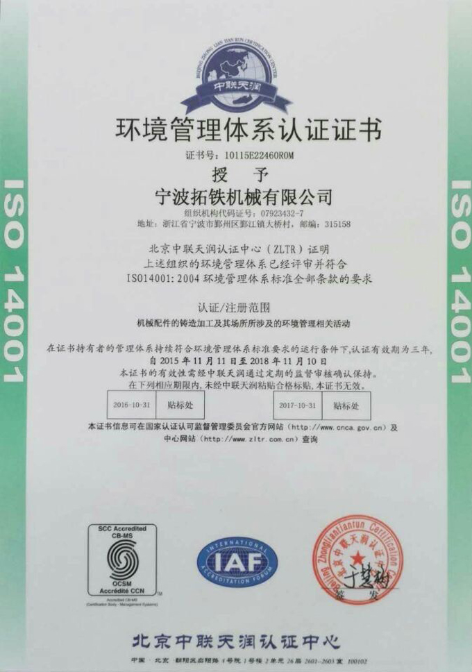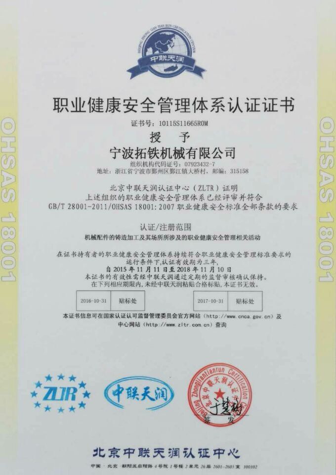 2015年11月,JY(中国)机械获得国家ISO9001质量管理体系认证,ISO14001环境管理体系认证和OHSAS18001职业健康安全管理体系认证。